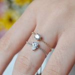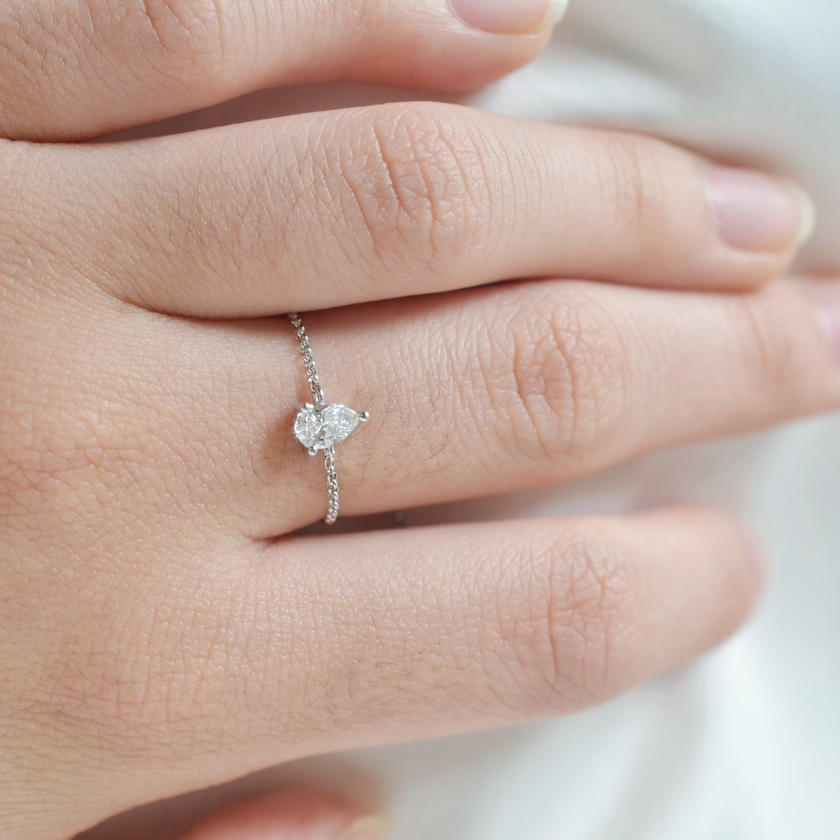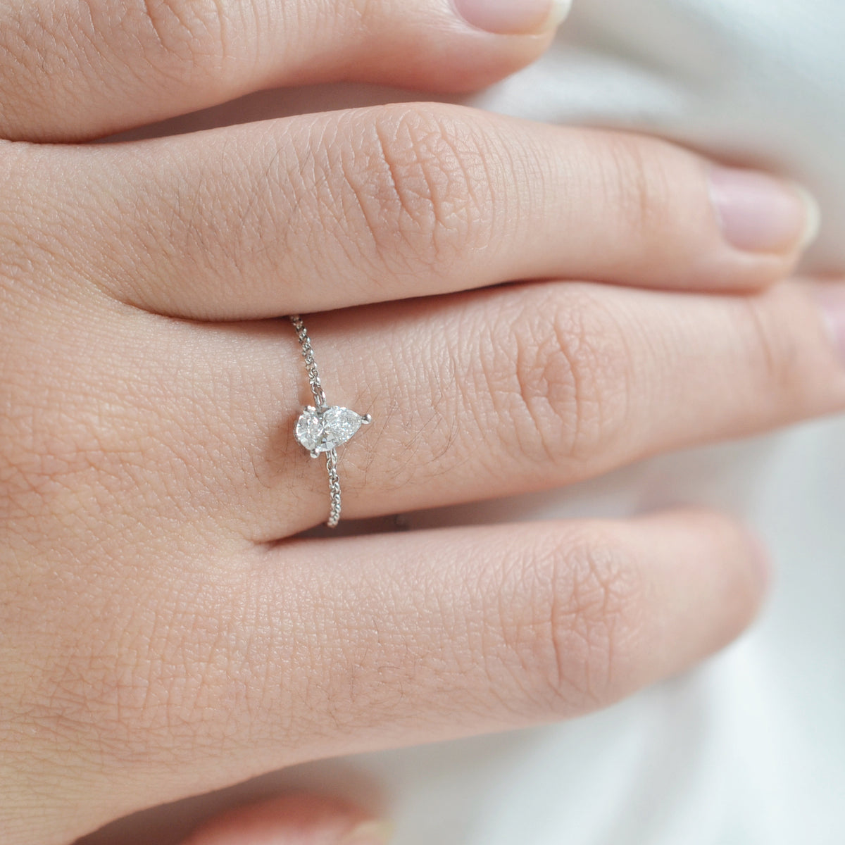 La bague Nova séduit par la délicatesse de son diamant taille poire, posé avec légèreté sur une monture en or blanc 14 carats.